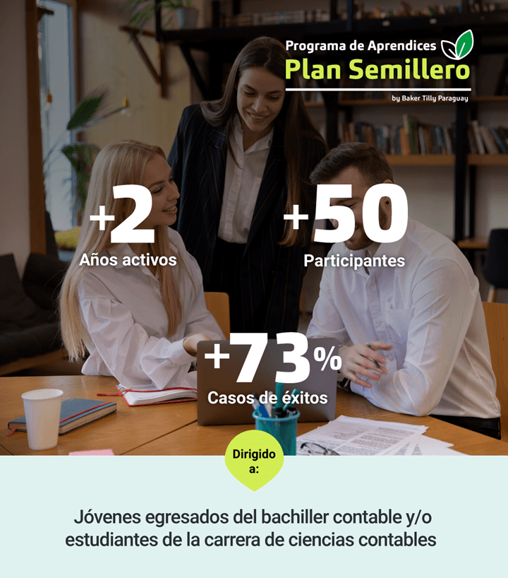 En Baker Tilly Paraguay, consideramos que los jóvenes talentos son la semilla de nuestro futuro, y estamos comprometidos en su formación y desarrollo. El “Plan Semillero” es más que un programa de aprendizaje; es una inversión en la próxima generación de profesionales que continuarán con nuestro legado de excelencia en la contabilidad.